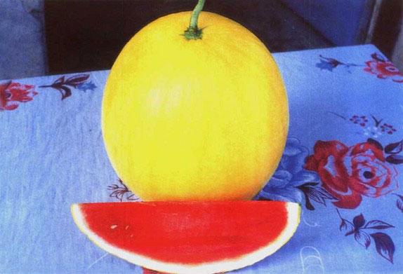 黄皮红瓤三倍体西瓜,中熟,果实授粉后约35天成熟,幼果绿色,随果实长大,逐渐变黄,单果重5千克,高圆形,味甜多汁,有香味,果皮金黄,果肉红色,宜作礼品瓜。抗病性与适应性强,可立体与非立体栽培。立体亩产6000千克,非立体亩产4000千克。开花后32-35天成熟胃在无籽西瓜中其熟性偏早。单果重约5.0千克.高圆形,皮色金黄,瓤色深红,味甜、多汁、有香味,中心可溶性固形物含量12.9%。耐贮运,货架期长。抗病性与适应性强,适宜保护地栽培及露地栽培。